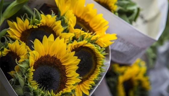 向日葵毕业花束:11枝香槟玫瑰、2枝向日葵、一朵蓝色绣球、13枝白色桔梗、尤加利叶,花语含义:即将毕业的学子,开始人生新的征程。2枝向日葵、3枝白荔枝玫瑰、香槟翠菊、黄色多头玫瑰、白桔梗、尤加利叶,花语含义:这世间所有的温暖,都值得我们怀念。
